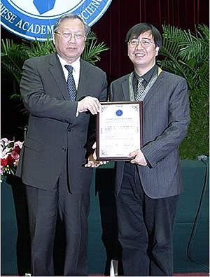 路甬祥院长为2005年中国科学院杰出科技成就奖获奖个人潘建伟颁奖