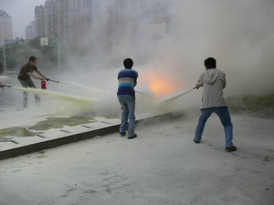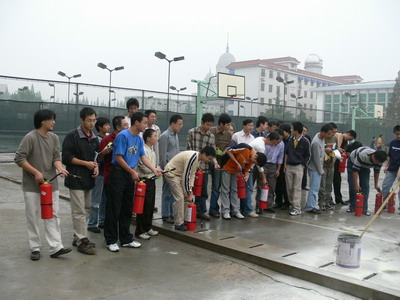 讲座结束后,同学们在保卫处有关部门负责人指导下逐一操练使用灭火器,并实践演练如何灭火。