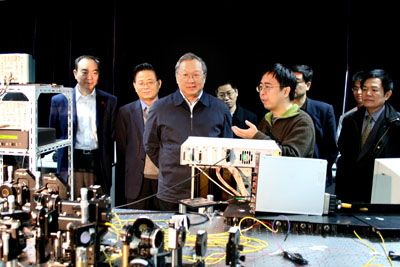 量子物理与量子信息研究部主任潘建伟教授就研究团队情况作汇报。路甬祥一行兴致勃勃参观了量子物理与量子信息实验室,就有关问题进行询问,并与有关科研人员亲切交流,勉励科研人员再接再厉,刻苦攻关,勇于攀登科学高峰,为增强自主创新能力,建设创新型国家做出更大贡献。