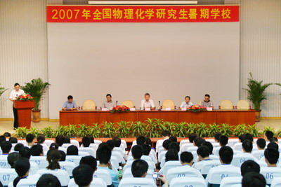 7月16日上午,由我微尺度物质科学国家实验室和物理化学学科共同承办的2007年全国物理化学研究生暑期学校开学典礼,在我校理化大楼东三学术会议厅隆重举行。来自全国高校、研究院所的248名在读博士、硕士研究生、青年学者及青年教师参加了开学典礼。我校校长朱清时院士出席仪式并致辞。国务院学位委员会办公室主任杨玉良院士应邀出席仪式并讲话。开幕仪式由我校常务副校长侯建国院士主持,本次暑期学校学术委员会委员厦门大学田中群院士、国家自然科学基金委计划局综合处田起宏处长、化学部物理化学处杨俊林处长等出席了开幕式。