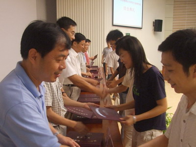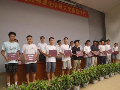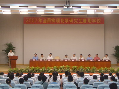 8月3日下午,2007年度全国物理化学研究生暑期学校在中国科学技术大学理化大楼东三学术会议厅举行了简短而隆重的结业典礼,标志着暑期学校的圆满结束。中国科学技术大学常务副校长侯建国院士、中科院大连化物所包信和教授、香港中文大学肖旭东教授、美国加州大学河边分校张劲松教授、中国科大合肥微尺度国家实验室和化学物理系的刘世林教授、杨金龙教授、张广照教授、石磊教授和胡水明教授出席了结业典礼。典礼由校研究生院副院长李晓光教授主持。