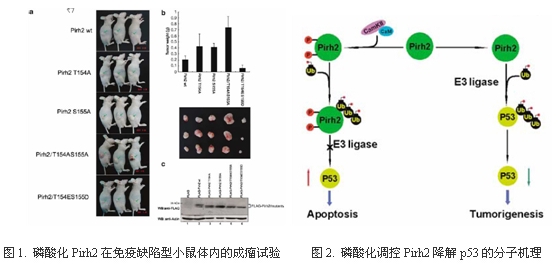 吴缅教授课题组的研究工作表明:Pirh2本身能够被磷酸化修饰,这种磷酸化修饰会导致Pirh2蛋白自身的不稳定以及介导p53泛素化降解功能的丧失;同时,Pirh2的磷酸化修饰也表现出细胞周期依赖性,一系列证据表明它可能影响p53参与的细胞周期调控。综合这些发现,并结合肿瘤组织样本与正常组织样本中Pirh2磷酸化水平的差异比较以及免疫缺陷型小鼠体内成瘤试验,他们首次证明了Pirh2的磷酸化调控对于p53的泛素化降解以及促进肿瘤生长起重要作用。
