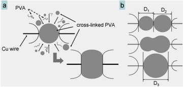 图2. 项链状铜/交联PVA核壳微纳电缆形成机理。