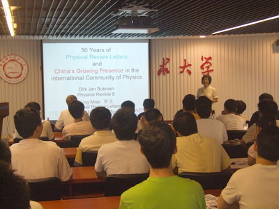 作为科大校友,缪凌女士首先对今年中国科大50周年校庆致以诚挚的祝贺,随后她介绍了Physical Review 系列的历史渊源,并对中国科学技术大学及中国物理学界对Physical Review 系列刊物的大力支持表示感谢。此外,她还向老师和同学们介绍了Physical Review 系列刊物的未来发展方向和即将推出的新刊物。Bulkman先生在随后的演讲中着重介绍了Physical Review 系列刊物中作者投稿时应当注意的几点要求,同时他还简要介绍了如何写好学术文章。报告会上,缪凌女士和Bulkman先生还就与会师生们的提问做了详细认真的回答。