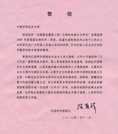 1月11日上午,2009年度国家科技奖励工作会议在人民大会堂隆重召开。党和国家领导人胡锦涛、温家宝、李长春、习近平、李克强等出席大会并为2009年度获奖者代表颁奖。我校张裕恒院士主持完成的“过渡族金属氧(硫)化物的电磁行为研究”成果获得国家自然科学二等奖。同日,中国科学院院长路甬祥院长代表院党组并以个人名义向我校发来贺信,祝贺该项成果获得国家自然科学二等奖。