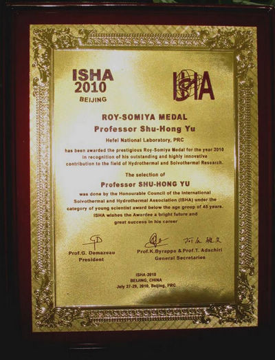 29日,国际溶剂热水热联合会主席、法国波多尔大学Gerard Demazeau教授和下一任主席、美国宾夕法尼亚州立大学Sridhar Komarneni教授宣布,国际溶剂热水热联合会(ISHA)资深理事会经过投票,决定将2010年度Roy-Somiya Medal奖章授予中国科大俞书宏教授,以表彰他对国际水热和溶剂热反应研究领域所做出的突出而富有创新性的贡献。这是继美国学者之后,在国际上获得该奖章的第二位学者,也是第一位获得该奖的中国学者。俞书宏教授应邀出席了颁奖仪式并在获奖致辞后,应邀做了“Hydrothermal/Solvothermal Process: Powerful Routes for Controlled Synthesis of Functional Materials”的学术报告。