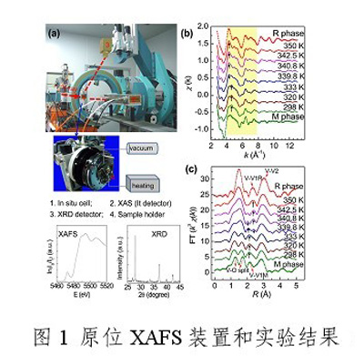 我室纳米材料与化学研究部谢毅教授与国家同步辐射实验室韦世强教授和吴自玉教授带领的联合科研小组,利用同步辐射变温X射线吸收精细结构谱学(XAFS)方法(见图1),原位研究了VO2的金属-绝缘体相变机理,首次展示了VO2在相变温度点(68摄氏度)附近的原子结构和电子结构的变化 (见图2),从原子结构层次提出晶体结构转变和电子关联性协同作用促使VO2产生金属-绝缘体相变的微观机理,解决了长期以来对VO2相变机理的争论。此项研究成果为设计基于钒氧化物的新型智能窗材料及其应用提供了理论基础,于2010年11月26日发表在《物理评论快报》[Phys. Rev. Lett. 105, 226405 (2010)],受到国内外同行的高度评价和广泛关注。
