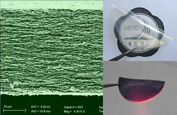 左:论文被德国《应用化学》选为卷首插画发表;右:粘土-壳聚糖生物纳米复合薄膜的层状结构特征;右图右上:薄膜的照片,下图右下:薄膜在火苗上灼烧后的照片。