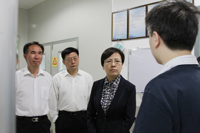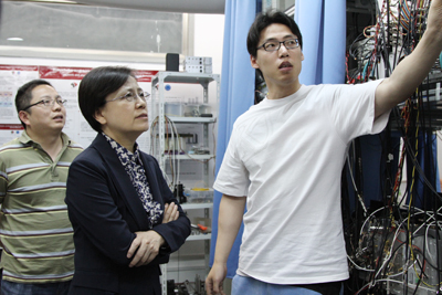 鲁昕副部长参观了量子物理和量子信息实验室及化学物理联合实验室,听取科研人员关于冷原子量子存储和冷原子痕量检测研究情况介绍,饶有兴趣地询问工作原理、研究进展以及应用前景等情况。当了解到实验室研究队伍很年轻,许多是“70后”、“80后”时,她感到十分高兴,认为实验室队伍水平高,培养的研究生质量高,大有可为,大有希望。