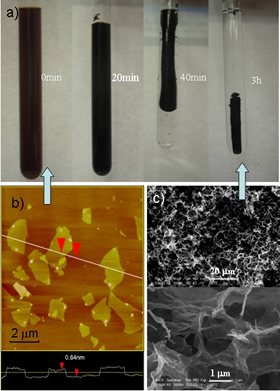b)石墨烯氧化物的AFM图片; c)制备得到的三维凝胶的微观结构。