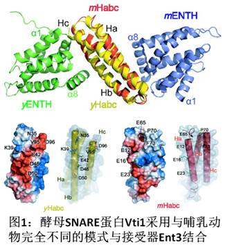 该研究小组利用X射线晶体学、生物化学及细胞生物学技术手段解析了酵母ENT3-ENTH结构域和Vti1蛋白N端结构域单体及复合物三维结构,首次发现酵母SNARE蛋白Vti1采用与哺乳动物完全不同的结合位点与接头蛋白Ent3相结合(图1),相应的酵母双杂交、胞外Pull-Down及细胞实验也都证明新发现的结合面 在Vti1蛋白的体内定位过程中起到决定性作用。这一原创性的发现表明真核生物囊泡转运过程中,SNARE蛋白与接头蛋白的识别模式存在多样性。该研究成果为真核生物囊泡转运过程的机理研究提供了新的线索和思路。