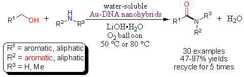 最近,该研究小组又应用Au-DNA非均相催化剂于酰胺化反应,成功实现各种醇类和胺类的直接酰胺化。实验结果表明,在Au-DNA的非均相催化作用下,带有不同官能团的醇类化合物和胺类化合物都能被用作反应底物,反应可以在水中温和、高效的进行。以前难以反应的芳香醇和芳香胺在该条件下都能够直接酰胺化。相关工作发表在Angew. Chem. Int. Ed., 2011, 50, 8917-8921。