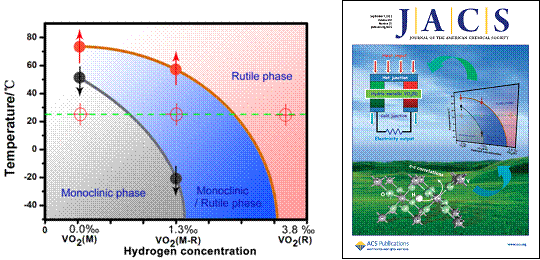 左图:氢掺入钒氧体系后的结构相图示意图。右图:该工作选为《美国化学会志》杂志封面彩图。