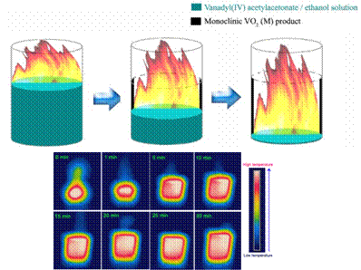 上图:限域空间燃烧法合成VO2(M)的流程示意图。下图:红外相机反映的高温区域蔓延趋势图。