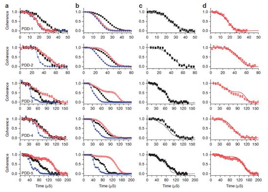 杜江峰教授研究组利用金刚石超纯样品中的N-V空位色心构成的三能级体系,研究其退相干现象。在这一体系中,中心电子自旋和周围的数百个碳十三核自旋相互耦合。而|1> 和|-1>叠加态(二阶相干项)和环境的耦合强度是两倍于|1> 和|0>叠加态(一阶相干项)与环境的耦合。在常温下,由于核自旋的随机朝向带来的热涨落会导致系统很强的退相干效应。此时这一退相干过程是经典的。为了看到非经典的退相干过程,研究人员利用动力学解耦技术消除经典噪声。随后观察到的现象令人惊奇:随着动力学解耦阶数的增加,二阶相干项的相干时间比一阶相干项增长得更快,最后二阶项的相干时间超过了一阶项。在未使用任何拟合参数的情况下,理论数值模拟得到数据和实验数据符合得非常好。