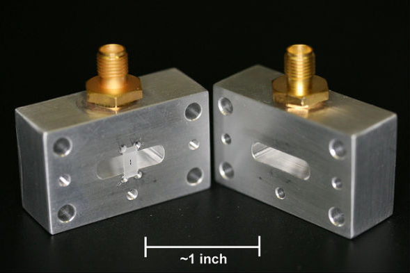 IBM的3D超导量子比特装置,一个量子比特(长度大约在1毫米左右)悬浮在小型蓝宝石芯片的空腔中央。这个空腔由装置的两半闭合后形成,测量通过向连接器传递微波信号进行。空腔的宽度大约在1.5英寸(约合3.81 厘米)左右。对于单个量子比特演示来说,这个装置的尺寸似乎有点大。研究小组表示这一系统可以按比例放大,容纳数百或者数千个量子比特