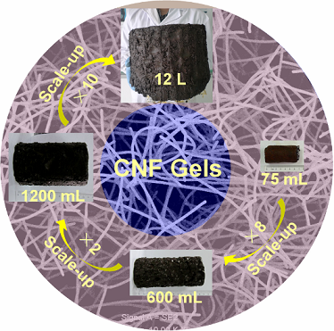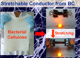 图3.左图:三维高质量碳纳米纤维仿海绵水凝胶的宏量制备获得成功;右图:以细菌纤维素纳米纤维为支架制备的可拉伸弹性导体。