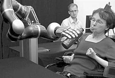 称为“大脑之门”的脑机接口允许哈钦森利用她的意念来指挥机器手臂,这是数十年研究结出的硕果。20世纪60年代的猴子实验,首次将手臂动作与脑部特殊神经元的激活联系起来。2008年,科学家报告说,一个意念控制的义肢可让猴子给自己喂食。