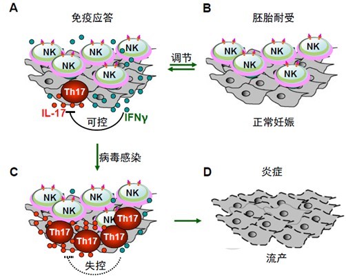 妊娠是一个复杂的生理过程,胚胎细胞对于母体来说是一个半基因不合的异物,母体免疫系统识别后会发生免疫排斥,类似于器官移植后的排斥反应。研究人员发现在妊娠过程中,母-胎界面存在大量与众不同的自然杀伤细胞(NK细胞),天然杀伤能力很低,但可以产生伽马干扰素,抑制由于胚胎基因不合而产生的炎性Th17细胞,并将Th17应答控制在生理范围内,维持母胎耐受和免疫平衡。如果母体同时遭遇病毒等病原体感染,会产生大量Th17细胞,导致炎症反应,自然杀伤细胞失去抑制能力,甚至暴露出杀伤的真面目,加剧胚胎局部的免疫反应和炎症反应,最终导致胚胎丢失或流产(图1)。相关研究成果发表在2013年1月15日的美国科学院院刊(PNAS. 2013 Jan 15; 110(3): E231-40)上。