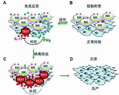 (中国科大研究人员发现),在妊娠过程中,母-胎界面存在大量与众不同的自然杀伤细胞,天然杀伤能力很低,但可以产生伽马干扰素,抑制由于胚胎基因不合而产生的炎症细胞,使母体对胎儿并不产生排斥反应。如果母体同时遭遇病毒等病原体感染,会产生大量炎症细胞,导致自然杀伤细胞失去抑制能力,甚至显出杀伤力,最终导致胚胎丢失或流产。该研究1月15日发表在美国《国家科学院院刊》。
