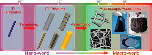 Acc. Chem. Res. 2013, 46, DOI: 10.1021/ar300272m),全面总结和回顾了该课题组近十年来在该领域取得的系列重要成果(图2),总结了本课题组提出并发展的多重模板法技术的发展过程、化学转化、组装等关键技术和概念,如何实现了超长径比纳米线及组装体的制备,并指出在纳米纤维组装与功能化研究中所提出的概念和使用的方法可推广至其他材料体系,例如,零维纳米颗粒和二维纳米片,以期获得更为广泛的新型宏观纳米构筑单元组装体功能材料。