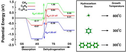 图1. 利用不同的碳源分子以及相应的London色散力大幅降低石墨烯外延生长温度的工作原理示意图
