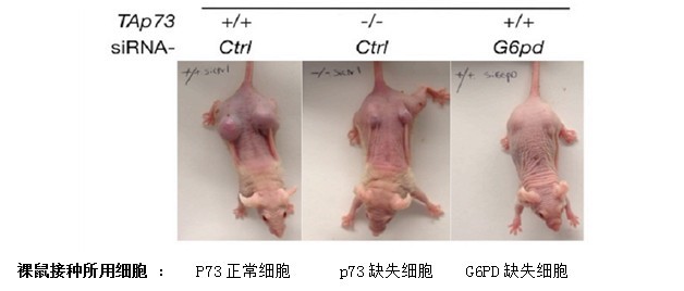 相对于p73正常的细胞(左图),p73缺失细胞(中图)的成瘤能力明显变小,如果G6PD被敲低(右图),细胞成瘤能力也会变小。P73通过G6PD促进肿瘤生长。
