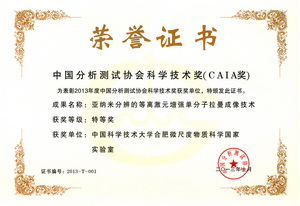 CAIA奖作为国家承认的由社会力量设立的唯一科学技术奖,正在越来越受到我国分析测试领域广大科技工作者的关注和欢迎。该奖设立于1993年,每年评审一次,用于奖励高水平的分析测试成果,其中特等奖授予“具有国际领先水平或特大社会经济效益”的重大成果,20年来仅有6项成果获得了CAIA特等奖。2001年,我校理化科学中心侯建国、王海千、杨金龙等教授的“单分子扫描隧道显微技术”曾获得CAIA特等奖,也是全国高校系统获得的第一个特等奖。CAIA特等奖自2001年已连续空缺11年,今年我校“亚纳米分辨的等离激元增强单分子拉曼成像技术”再获特等奖,使我校成为国内唯一两获此殊荣的单位。