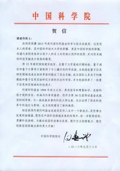 我室潘建伟院士于10月30日在北京被授予2013年度何梁何利科学与技术成就奖,中国科学院院长白春礼发来贺信,“代表党组并以我个人的名义”向潘建伟院士获得何梁何利科学与技术成就奖致以热烈的祝贺。