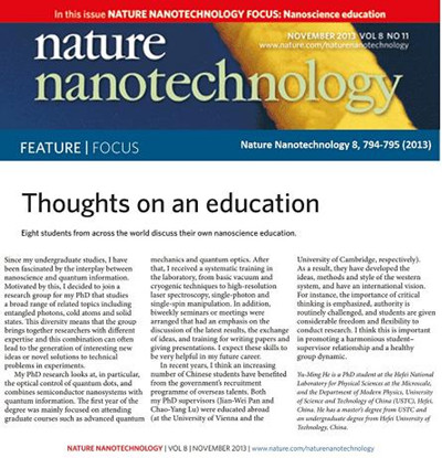 近年来,纳米科学与技术快速发展,并不断与其他学科交叉融合,已经引起科学界和产业界的极大关注。该领域的国际权威杂志《自然·纳米技术》不仅紧密跟踪纳米前沿研究的进展,同时也一直关注各大学和科研机构在研究生培养和教育方面的方法。为此,《自然·纳米技术》出版了本期聚焦纳米科学教育的专刊,邀请了来自世界范围从事纳米及相关领域研究的8名学生撰文分享他们各自接受教育的经历、经验和观点,以促进国际各教育机构之间的沟通与交流。