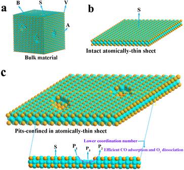 研究活性中心与催化活性之间关系的三种典型模型: (a)块材,(b)超薄纳米片,(c) 富含表面凹坑的超薄纳米片。