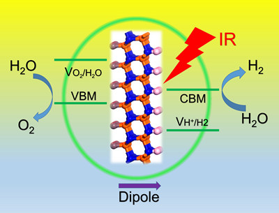 利用太阳光分解水制氢,为人类提供清洁燃料,被视为化学的圣杯。水分解是吸热反应,传统理论要求光催化剂的能隙至少要大于反应吸热(1.23eV),因而占太阳光能量近一半的红外光无法被吸收用来分解水制氢。杨金龙教授研究组提出具有內禀电偶极矩的二维纳米催化剂,可突破传统理论对催化剂能隙的限制,用红外光也可以分解水产生氢气。这种催化剂存在偶极内电场,吸附在催化剂两个表面上的水分子会感受到不同的静电势,从而导致两个表面上水的氧化还原电势变得不再相同。如果氧化和还原分别发生在不同的表面,催化剂受到的能隙限制原则上将不再存在。在这一新的光解水机制中,不仅紫外光和可见光,红外光也可以用来促使水分解产生氢气。另外,这种催化剂的光激发是一个电荷转移过程,电子和空穴分别产生在两个不同的表面,催化剂固有偶极电场有效促进了光生电子空穴对的空间分离,并做功帮助水分解产生氢气。基于这一机制,他们设计了一种双层氮化硼纳米体系,其两个表面分别用氢和氟修饰。理论计算与模拟表明这是一种有效的红外光催化分解水体系。