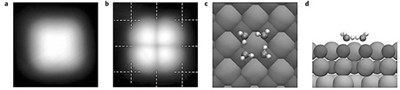 图a—d为水团簇在盐表面上的氢键构型(图a、b为显微镜下的图像,图c、d为不同视角的理论模拟结构图)。