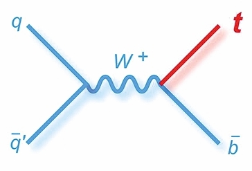 上图表显示了s-通道单顶夸克的产生过程:在Tevatron粒子加速器中,来自注入质子的夸克和来自注入反质子的反夸克相互作用,形成一个质量更大的W玻色子;W玻色子随即衰变成一个顶夸克和一个反底夸克,并被CDF和Dzero两个实验小组探测到。费米国家加速器实验室供图