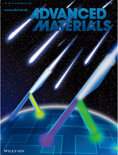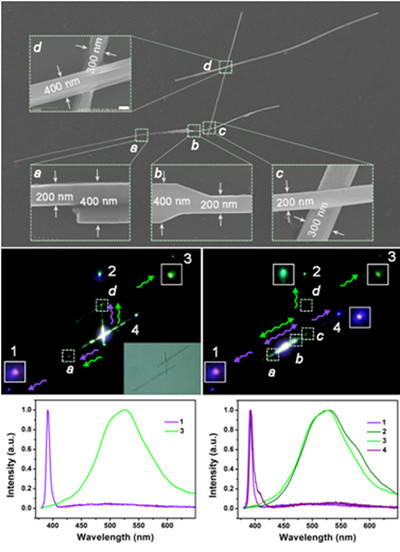 光信号在纳米线中的传输主要依赖于纳米线腔体对光的限域能力,不同直径的纳米线可以限域不同波长的光信号。每个特定波长的光信号都有相应的截止直径,在低于此截止直径的波导通道中,光信号便不能继续传播。该实验室科研人员通过两步法气相合成氧化锌纳米线同质结,并且通过操纵单根纳米线同质结,构筑纳米线光子回路,实现了紫光和绿光信号的分离和传输。进而集成多个同质结和交叉结,成功构筑了多通道的光学分波器。该成果被邀请作为当期的内封面文章(图2)。