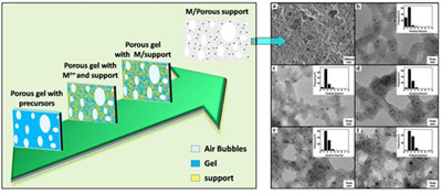 在国家自然科学基金委、科技部和中国科学院的大力支持下,中国科学院化学研究所胶体、界面与化学热力学实验室与中科院高能物理研究所同步辐射实验室合作研究发现,无机盐可以诱导离子液体形成热力学稳定的水凝胶,并且可以制备多孔离子液体水凝胶。在此基础上,他们提出了利用离子液体多孔水凝胶一步合成负载型金属纳米催化材料的方法。这种方法具有普适性好、绿色环保、操作简单等优点,体载体可以是无机材料、有机高分子材料、有机无机杂化材料等。利用此方法制备的催化剂具有金属纳米粒子尺寸小、尺寸分布很窄、载体具有多级孔结构等特点。制备的Au/SiO2、Ru/SiO2、Pd/Cu-MOF分别对苯甲醇氧化酯化反应、苯加氢反应、苯甲醇氧化反应具有极高的催化活性、选择性和稳定性,并且容易重复使用。这一新颖方法在高效负载型纳米催化材料制备方面具有良好的应用前景。相关成果发表在近期的《美国化学会志》(J. Am. Chem. Soc., 2014, 136, 3768-3771)上。