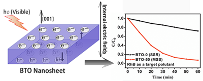 科研人员利用可控制备的钛酸盐样品对罗丹明B偶氮染料(Rhodamine B,RhB)进行可见光催化降解实验发现,熔盐法制备出的钛酸盐材料对于可见光响应效率较高。进一步分析表明,材料的大小和厚度对于光催化降解RhB有很明显的差异。通过EIS(Electrochemical Impedance Spectroscopy)和KPFM(Kelvin Probe Force Microscopy)实验分析证实,由于所制备出的钛酸盐材料在沿其c轴方向有4 μC cm 2的自发极化,在其c轴方向会产生内部电场,故而在可见光照射下,材料所激发出的光生空穴和电子在内部电场的导向下会各自有效分离,从而提高材料的光生空穴和电子的分离效率,进而提高其光催化性能。该研究为钛酸盐的可控制备及高效光催化材料的筛选提供了新的方法和借鉴,并且为研究层状钙钛矿材料的自发极化在光催化性能方面的作用奠定了基础。