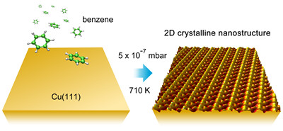 二维碳基纳米结构因其在量子、信息、光电和催化等领域的潜在应用受到广泛的重视,然而迄今为止绝大多数已经成功制备的二维碳基纳米结构都是由石墨烯材料衍生而来,因此,寻找和制备具有新的结构和性质的二维碳基纳米结构一直是物理、化学和材料领域内一个重要的研究目标。传统的聚合物制备方法受到反应环境的限制,难以制备出仅有单层原子或单层分子厚度的二维纳米结构。研究人员提出了一种新的基于超高真空的化学气相沉积方法,利用苯作为反应源,在铜单晶表面成功制备出一种新型的大面积、高度有序的二维碳基纳米结构。扫描隧道显微镜、X射线光电子能谱并结合第一性原理的理论计算表明这一二维碳基纳米结构由铜原子配合的聚苯链构成,并且表现出明显的半导体特性,有望被用于二维电子学器件。这一研究发现为进一步发展基于超高真空技术的新型二维有机纳米结构制备提供了研究基础。