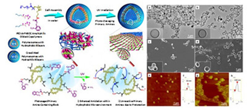 众所周知,相对于小分子磷脂囊泡,聚合物囊泡由于其疏水双层膜中高分子链之间的高度缠结而具有相对较高的结构稳定性,因此近些年来被生物医药和化学材料等领域的科研工作者广泛关注和研究。事实上,为了进一步提高聚合物囊泡的稳定性,传统上是通过囊泡双层膜的交联(包括物理和化学途径),以保证囊泡在实际应用的复杂环境中的结构稳定性。但是,也正是由于聚合物囊泡双层膜中高分子链的高度缠结和交联而使得囊泡的渗透性相对于磷脂囊泡大大下降,极大程度上限制了囊泡内腔与外界环境间的物质传输性能。针对这一矛盾问题,刘世勇教授指导的博士生汪枭睿设计了一种疏水链段由光响应性疏水基团保护的伯胺侧基单元所组成的两亲性嵌段聚合物(PEO-b-PNBOC),并通过可控分子自组装构筑了聚合物囊泡组装体。然后在光照刺激条件下,使囊泡双层膜中的伯胺保护基团发生光解反应而释放出伯胺,原位生成的伯胺能有效的与链段侧链的酯键基团发生氨解反应,即使得囊泡发生化学交联;同时部分没有发生反应氨解反应的伯胺被质子化而在双层膜中产生了亲水通道,即提高了囊泡的渗透性。通过简单的光照刺激就实现了囊泡结构稳定性与渗透性的同步调控。进一步的,他们利用这一体系,初步探索了其在疏水/亲水药物同步释放及酶反应器活性调控方面的潜在应用。相关内容已申请国家发明专利。同时,该工作发表后也很快被Nature Chemistry Highlight专栏评述 (DOI: 10.1038/nchem.1915)。