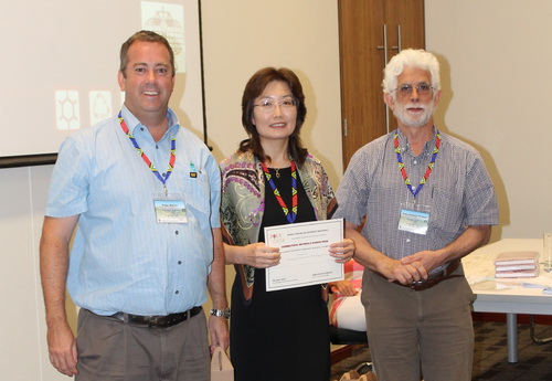 图:2014年度“国际材料科学奖”颁奖(中,徐春叶教授;左一,会议主席P. Mallon教授,化学与高分子科学系主任, University of Stellenbosch,南非;右一,评委会主席J. J. Pireaux教授,高分子物理科学家,University of Namur,比利时)