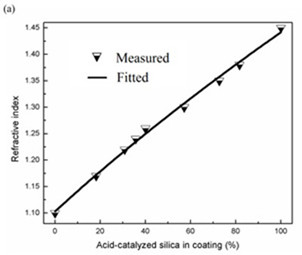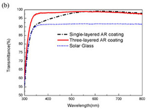 目前,团队正致力于第三代具有封闭孔隙的纳米宽光谱减反膜研究。单层减反膜在300-1200纳米波长光谱加权平均透过率已达97.34%,接近97.72%的理论极限,这一体系还具有显著的防雾效果。以此为基础,通过折射率调控技术(在1.10-1.45之间),实现了更为复杂的多层准渐变光伏减反膜,在进一步提升宽光谱减反射效果的同时,实现了更好的耐候性。部分相关研究成果近期发表在ACS Appl. Mater. Interfaces 6, 1415 (2014)和J. Sol-gel Sci. Technol. DOI: 10.1007/s10971-014-3364-y上,且已获授权中国发明专利(CN20120097416)。这一进展为进一步提升减反膜的宽光谱、全向和长效减反特性及其在光伏和光电器件等领域的应用奠定了坚实的基础。