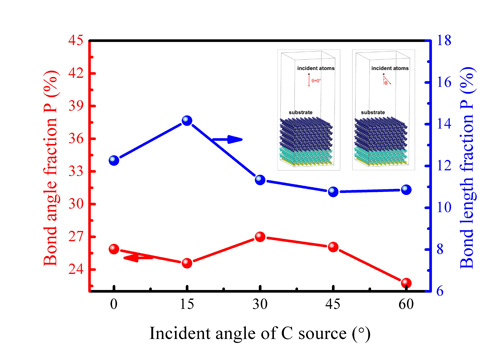 不同碳离子源入射角下ta-C薄膜的键长、键角畸变含量变化曲线(计算模型)