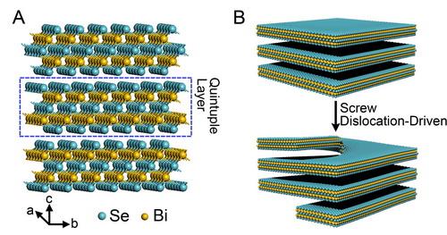 (A)Bi2Se3的层状晶体结构示意图;(B)将螺旋位错引入Bi2Se3导致的结构转变。
