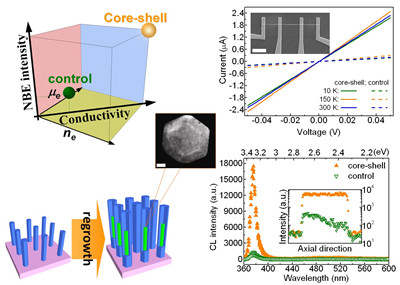 ZnO纳米线有着完美的光学纳腔结构和室温下丰富的多量子态耦合作用,不仅是凝聚态物理和量子光学领域的重要研究对象,也是纳米尺度紫外光子学和光电器件的候选材料之一。要实现纳米尺度的优质紫外光源,必须使ZnO纳米线同时拥有高效的带边发光和优良的电学性质,但现有的体掺杂方式难以同时满足上述要求。这是因为优良的电学性质要求材料通过掺杂提供浓度足够高的自由载流子,而过多的掺杂必将导致带边辐射复合效率的显著下降。