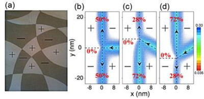 图 1:(a) 不同拓扑态组成的网络示意图,正/负用来表示各区域相反的外加电场或者相反的拓扑量子数;(b) 当右入射电流与下导线成90o,60o,120o入射角度时的电流的实空间分布示意图。上,下和左导线上的三个百分数表示出射在这三个导线上的电流的相对强度。