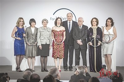 3月18日,2015年度“世界杰出女科学家奖”颁奖仪式在巴黎索邦大学举行,包括中国科学技术大学谢毅教授在内的5位女科学家获得该奖项。“世界杰出女科学家奖”由联合国教科文组织和法国欧莱雅集团联合设立,每年从全球各大洲遴选出5位为科学进步作出卓越贡献的女性,旨在公开表彰女科学家的杰出成就,并为其科研事业提供支持。教科文组织说,谢毅教授凭借其在无机化学领域的杰出贡献而获得表彰。图为中国教授谢毅(左二)在法国巴黎出席2015年度“世界杰出女科学家奖”颁奖仪式。 (新华社发)