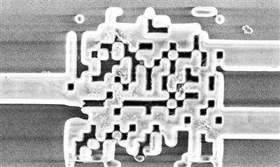 应用于硅光子芯片的新型分光器俯视图,其大小仅为人类发丝宽度的五十分之一。 美国犹他大学的工程师在研制比现有机器快数百万倍的下一代计算机和移动设备方面迈进了一大步:他们开发出了迄今最小的超紧凑型分光器,可将光波划分为两个独立的信息通道。这个新装置使制造利用光而非电子来计算和传输数据的硅光子芯片更接近现实。19日的《自然·光子学》杂志对这一成果进行了描述。