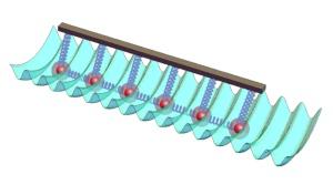 麻省理工学院的Vladan Vuletić和同事们把一排带负电的镱离子放在电场中,模拟出了一个“表面”,并用两台激光器发出的激光模拟出另一个“表面”,激光的干涉条纹对原子产生了周期性的力,就像金属表面的褶皱一样。研究人员让这排离子沿着激光滑过,激光对离子产生了压力可以模拟原子间作用力,在两种“固体”间产生了摩擦。