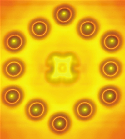 砷化铟晶体管的中心是酞菁染料分子,其周围环绕着12个带正电的铟原子。 在一个砷化铟晶体上,12个带正电的铟原子环绕着一个酞菁染料分子,这就是科学家最新研制的分子大小的晶体管。按照摩尔定律的硬限制,这很可能是一个晶体管所能达到的最小尺寸。