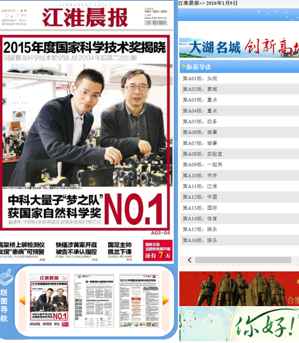 【江淮晨报】中科大量子“梦之队”获国家自然科学一等奖